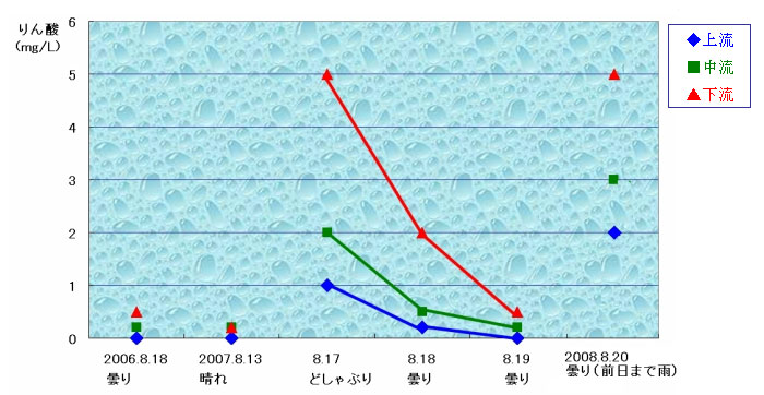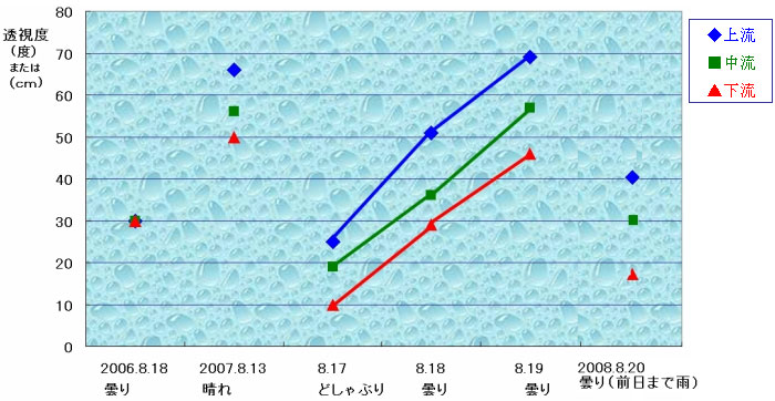 さらに、8月17日(土砂降り)、 18日(土砂降りの翌日。曇り)、 19日(土砂降りの翌々日。曇り) の3日間を連続して調査して、雨による川のにごりの変化を調査しました。