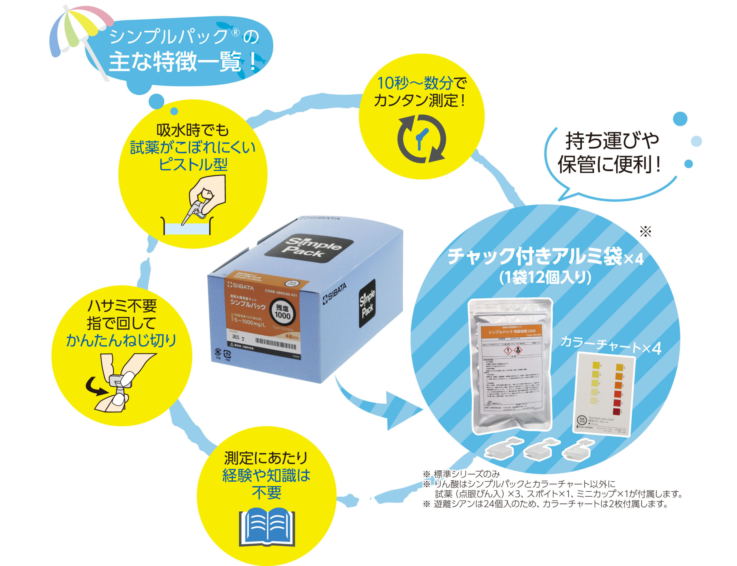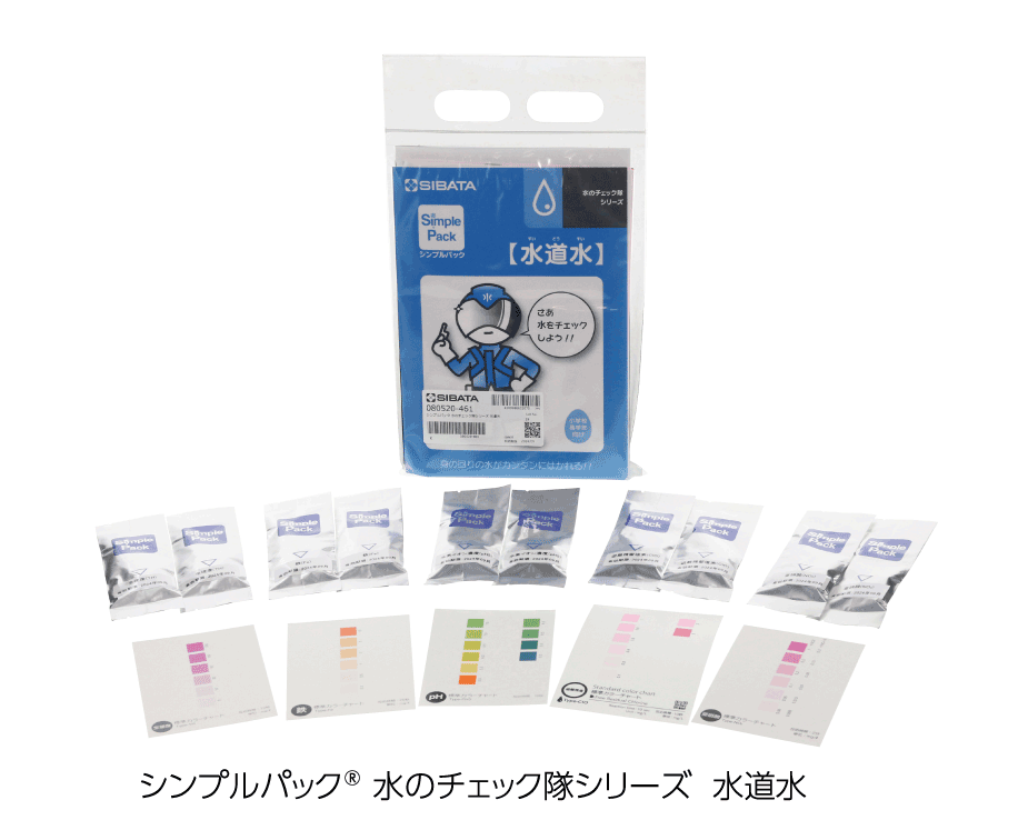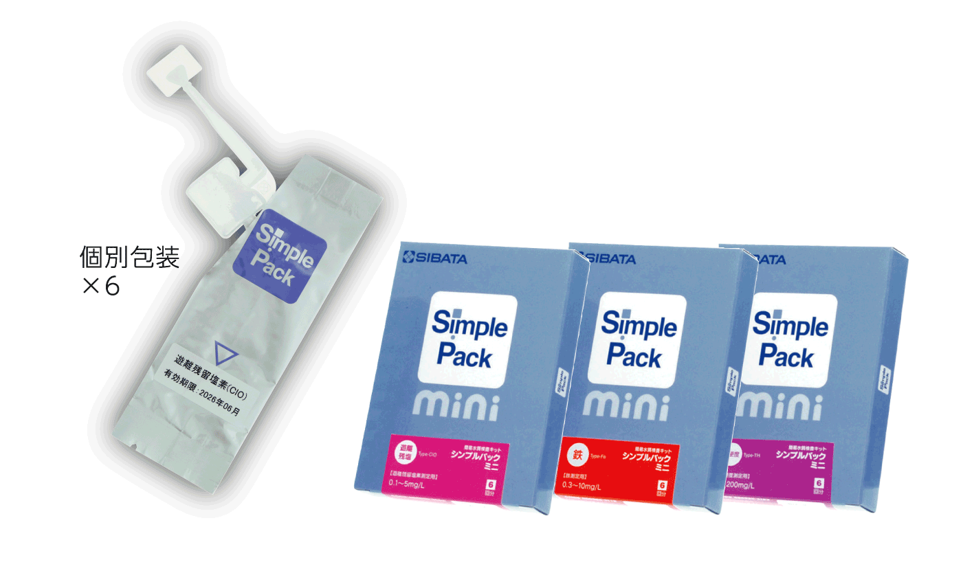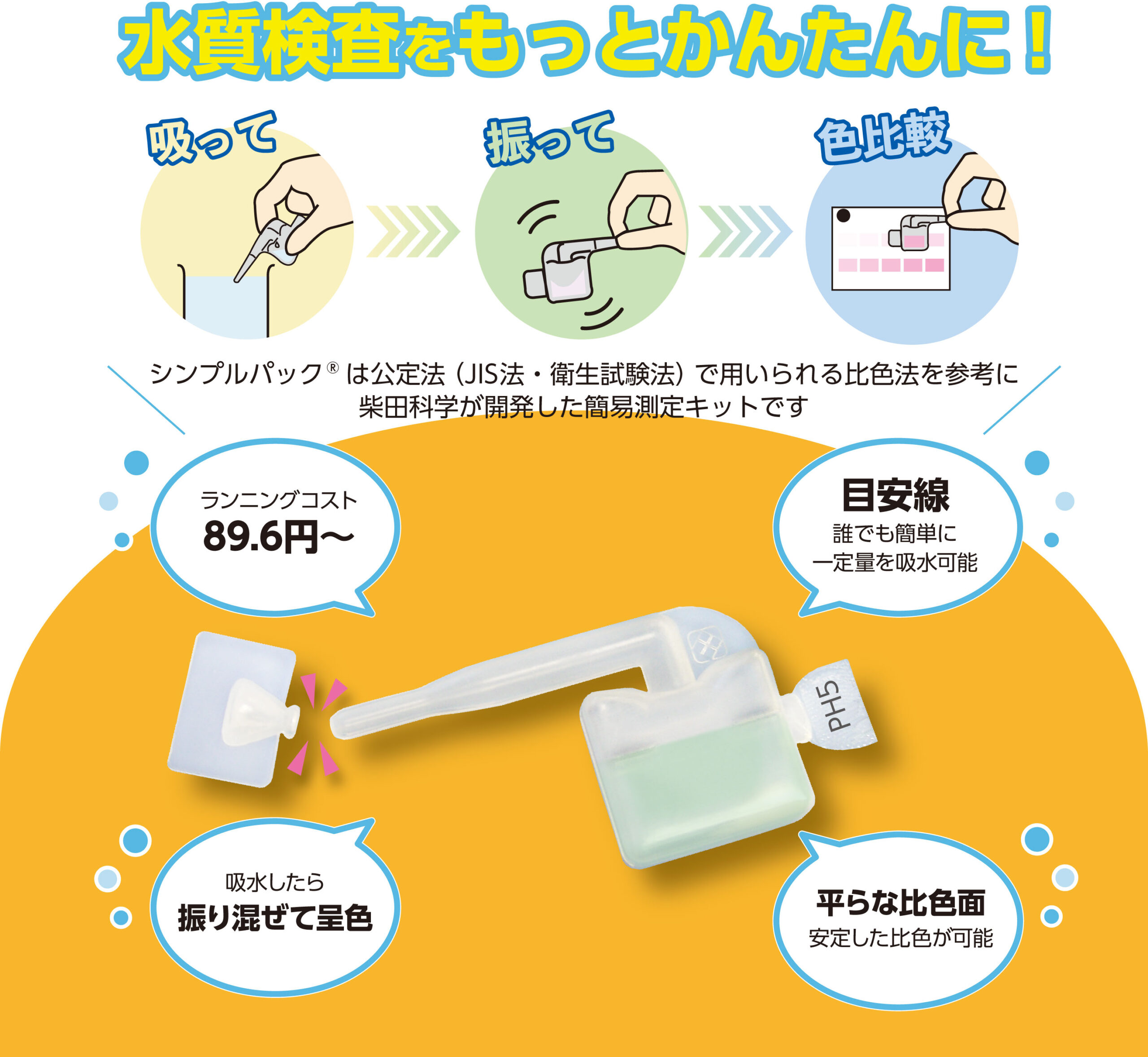 水質検査をもっとかんたんに!シンプルパックは公定法(JIS法・衛生試験法)で用いられる比色法を参考に柴田科学が開発した簡易測定キットです。