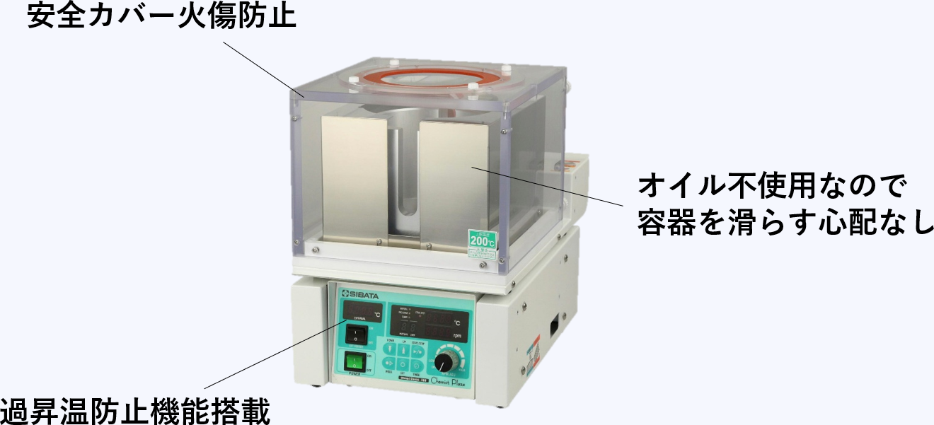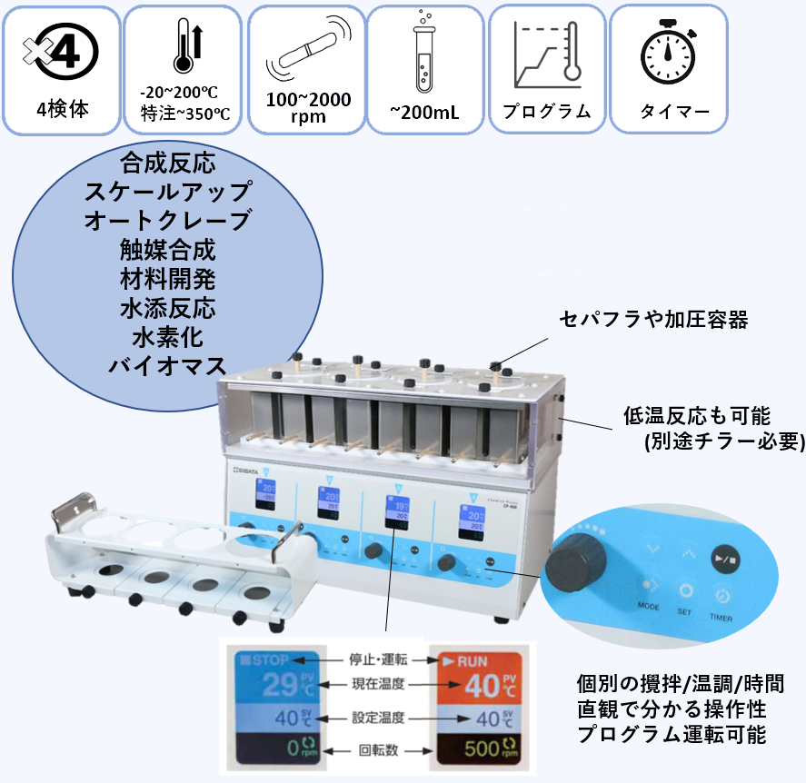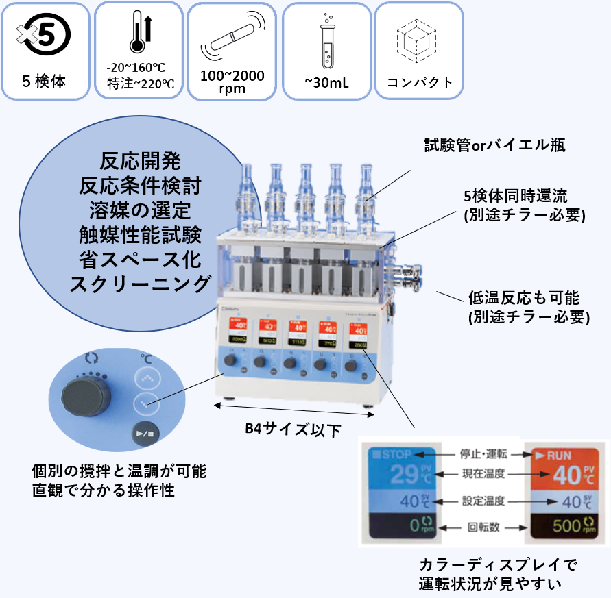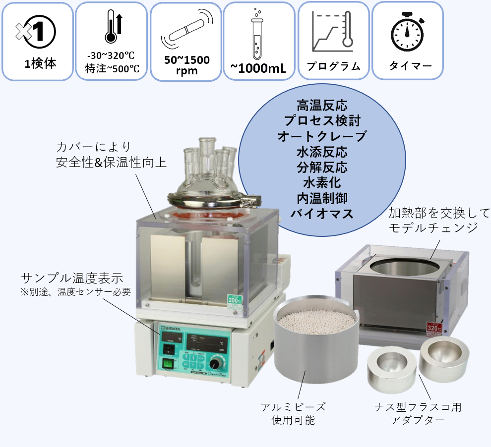 熱媒にアルミブロックを採用したケミストプラザシリーズ。「安全」「効率化」「省スペース化」をコンセプトに開発され、「有機合成」「材料合成」「触媒反応」など幅広い実験にご活用頂けます。