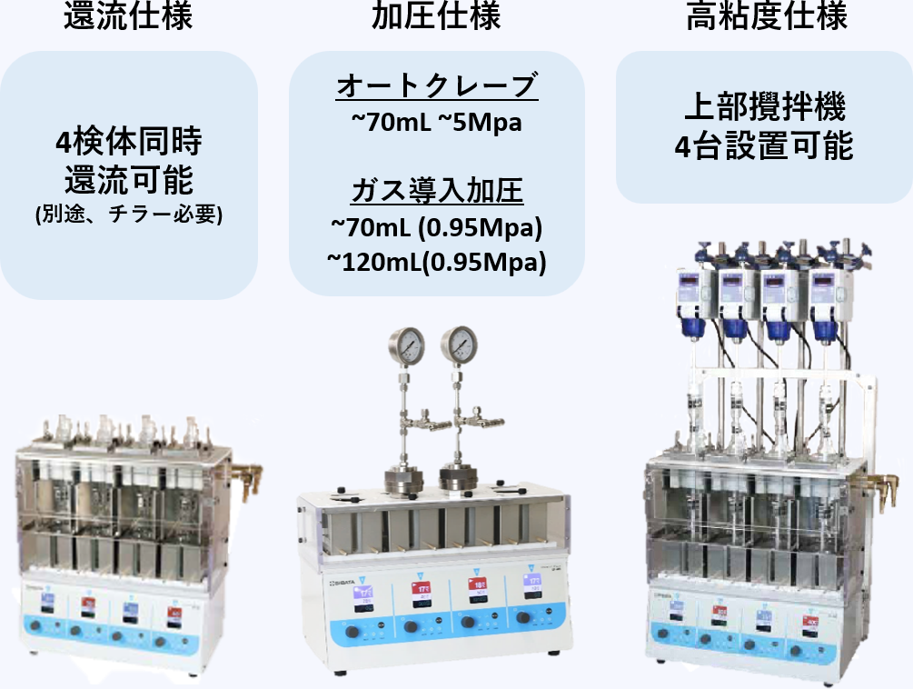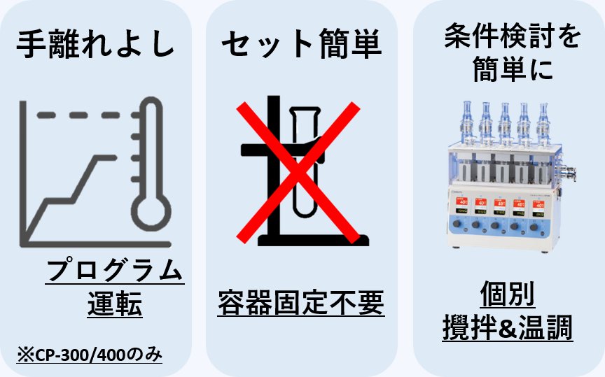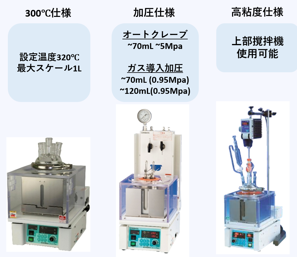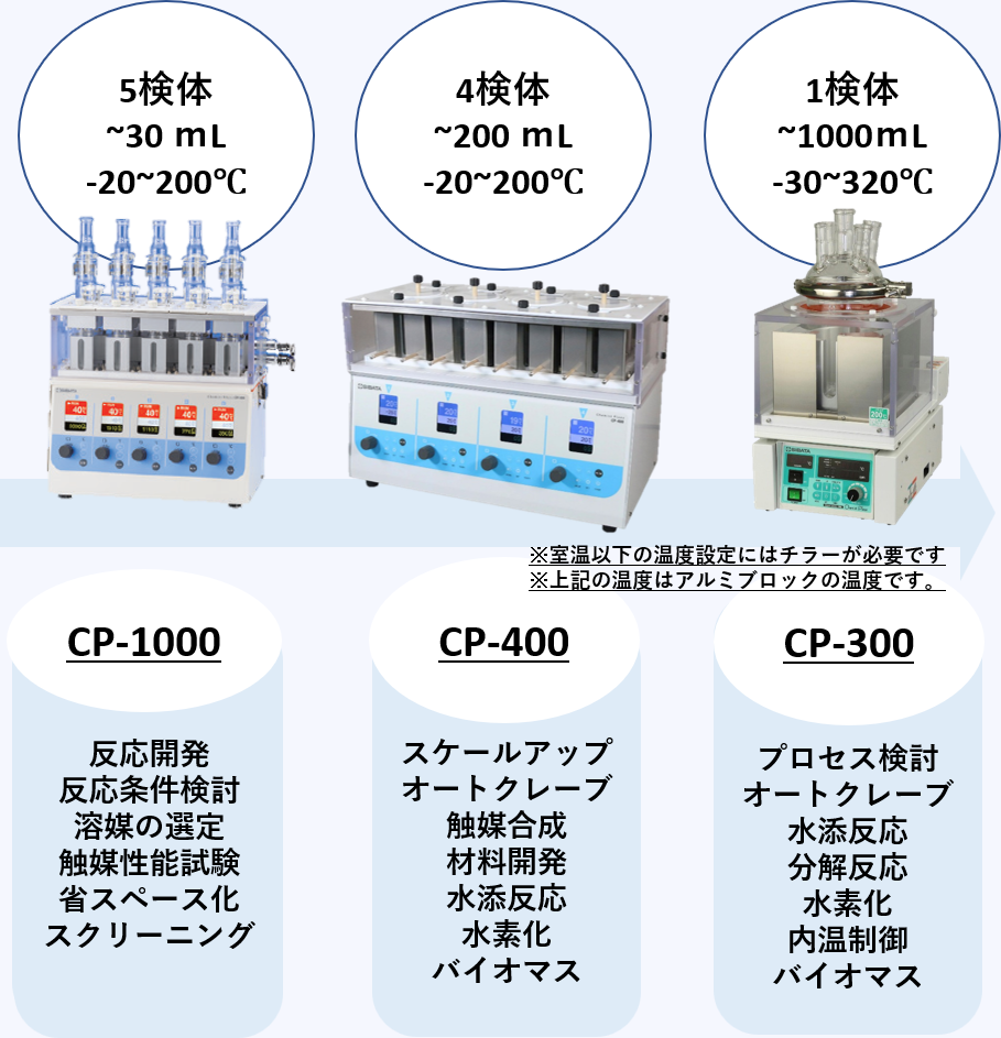 熱媒にアルミブロックを採用したケミストプラザシリーズ。「安全」「効率化」「省スペース化」をコンセプトに開発され、「有機合成」「材料合成」「触媒反応」など幅広い実験にご活用頂けます。